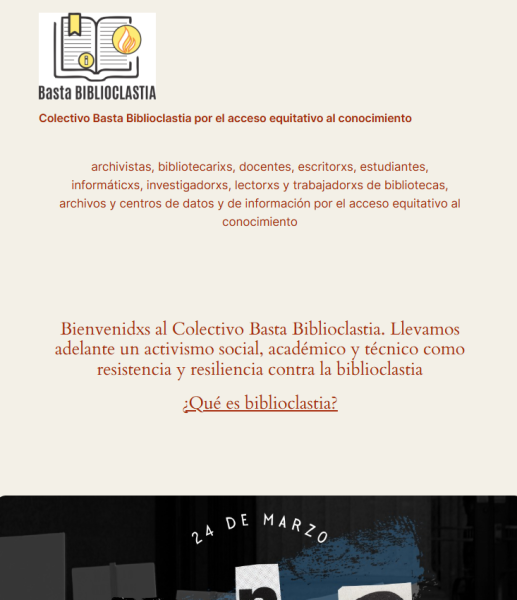 A falta de compreensão da profundidade desses acontecimentos fez com que, até hoje, não exista nenhuma lei que previna, repare ou puna os atos biblioclásticos, nem que responsabilize seus autores — sejam eles atuantes nos âmbitos educacional, comunitário ou governamental.O Colectivo Basta Biblioclastiaa, surgido em 2020, propôs-se a avançar no essencial: difundir a compreensão de que todos e todas, em algum momento de nossas vidas, já nos deparamos com atos biblioclásticos. Em períodos coloniais, em contextos de guerra ou ditaduras, com censura e destruição de recursos, assim como prisões e até desaparecimentos de pessoas que atuam nesses campos — mas não somente nesses casos. Mesmo em contextos democráticos, isso atinge da comunidade bibliotecária e arquivista, que veem seus recursos de serviço cada vez mais restritos e sufocados; atinge também docentes e leitores, que sofrem com esses cortes ou até com fechamentos inexplicáveis no meio digital.