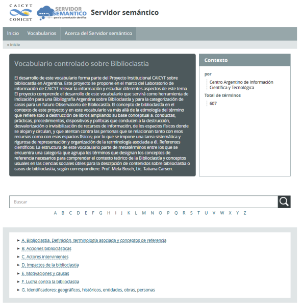 O projeto foi iniciado por Mela Bosch e Tatiana Carsen em 2015, no CAICYT, o instituto de informação e comunicação científica do CONICET, agência científica nacional da Argentina. Contamos com o respaldo de bibliotecários internos e externos para a busca de bibliografia, assim como com o suporte do inovador servidor semântico do CAICYT. É nesse ambiente que o Vocabulário permanece hospedado até hoje — e cuja visita recomendamos — agora ampliado com recursos gráficos inteligentes.