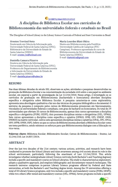 TREVISOL NETO, Orestes; BLATT OHIRA, Maria Lourdes; CAMARA PIZZARO, Daniella. A disciplina de “Biblioteca Escolar” nos currículos de Biblioteconomia das universidades federais e estaduais no Brasil. Revista Brasileira de Biblioteconomia e Documentação, São Paulo, v. 21, p. 1–23, 2025. Disponível em: https://rbbd.febab.org.br/rbbd/article/view/2112 . Acesso em: 4 jan. 2026.